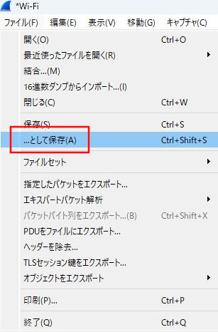 5.ツールバーのファイル > …として保存 を選択すると保存画面が表示されますので、任意のファイル名をつけて、拡張子「.cap」で保存します。