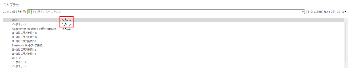 起動後、キャプチャの欄からグラフが動いているネットワークの中からキャプチャしたいネットワークをクリックします。
